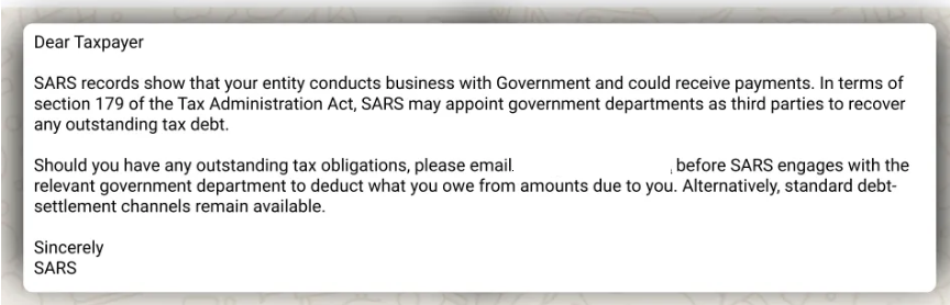 The South African Revenue Service (SARS) has appointed external debt collectors to help it collect outstanding debt owed by taxpayers. As part of the debt-collection process, SARS previously communicated with you regarding your debt and the payment options available to assist you to comply with your tax obligations.