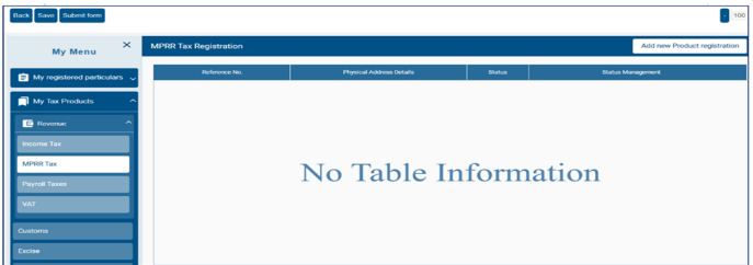 - Revenue>Income Tax >MPRR Taxes>Payroll Taxes >VAT>Customs>Excise>APT