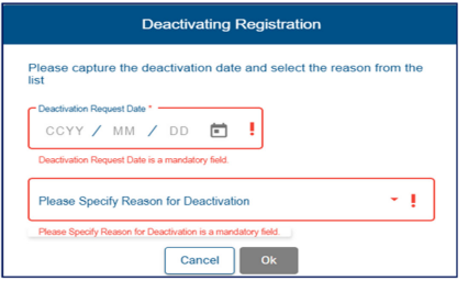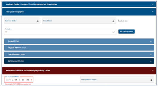 will be active on a new registration application and disabled for maintain details. - Note: In the case of a second income tax registration for the deceased estate, the liability date