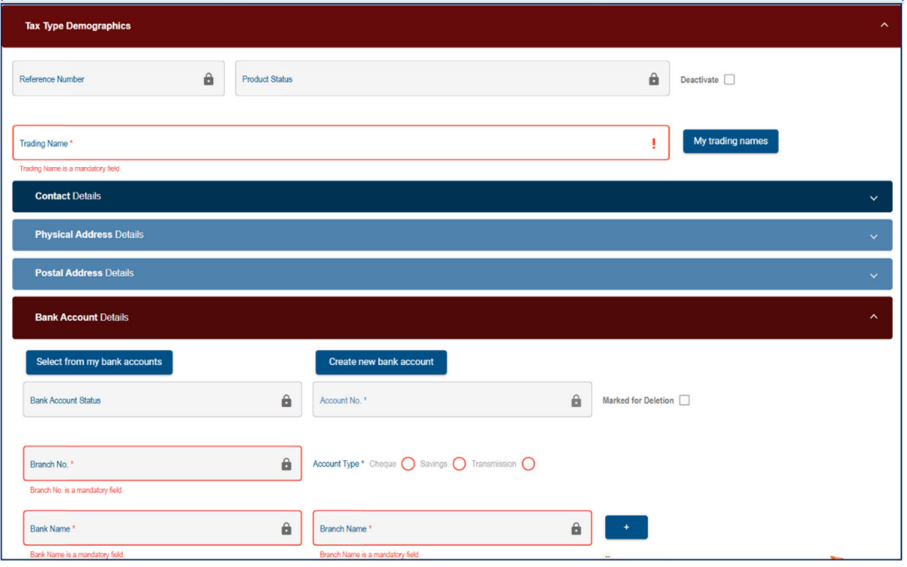 - My Registration details>My Addresses>My bank accounts>My Contact Numbers>My Email Addresses>My Trading Name Details