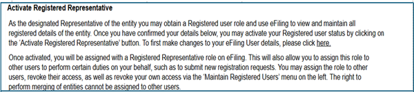 - If you are the appointed registered representative for an entity, you must activate the status on eFiling
