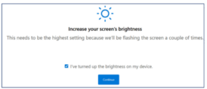 - Check the box confirming: “I have turned up the brightness on my device”, then click Continue.