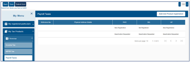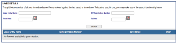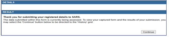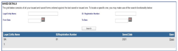 the registered details but not submitted to SARS. All issued and saved forms are displayed for the user - If there is no saved information, nothing will display.