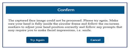 - When the system is unable to process the captured face image, the message below will appear: