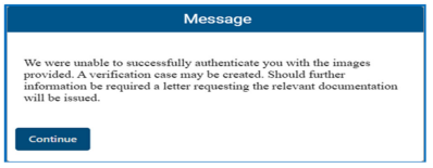 - The following message will be displayed when biometric facial recognition fails. A verification case will