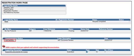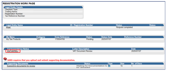 submitted. - Submit the relevant supporting documents. Refer to section SARS CORRESPONDENCE