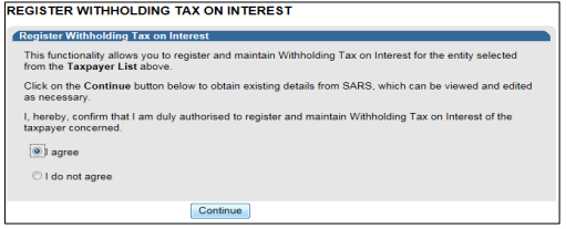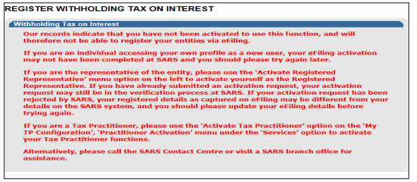 eFiling user and that your status is active. - The “Register Withholding Tax on Interest” functionality is hosted within the “SARS Registered