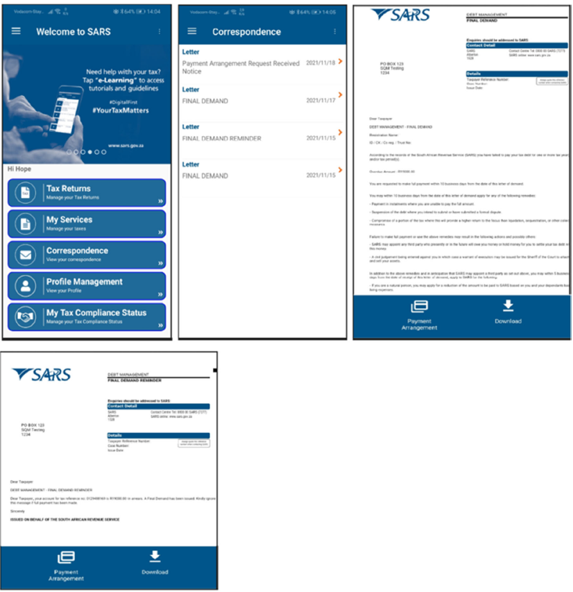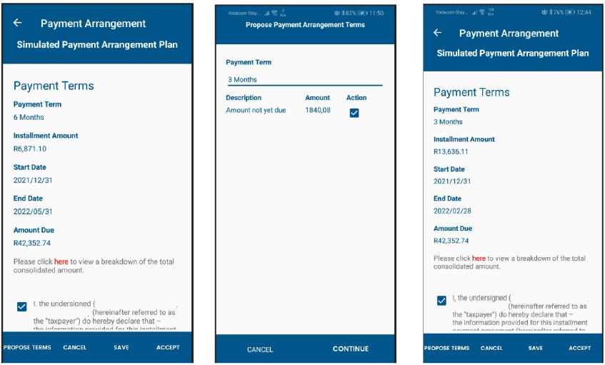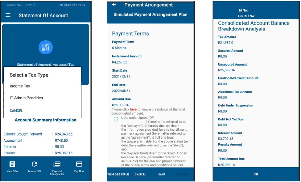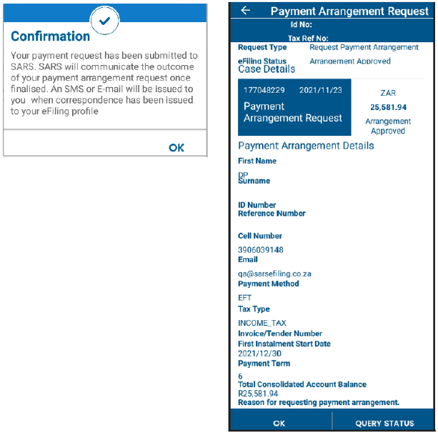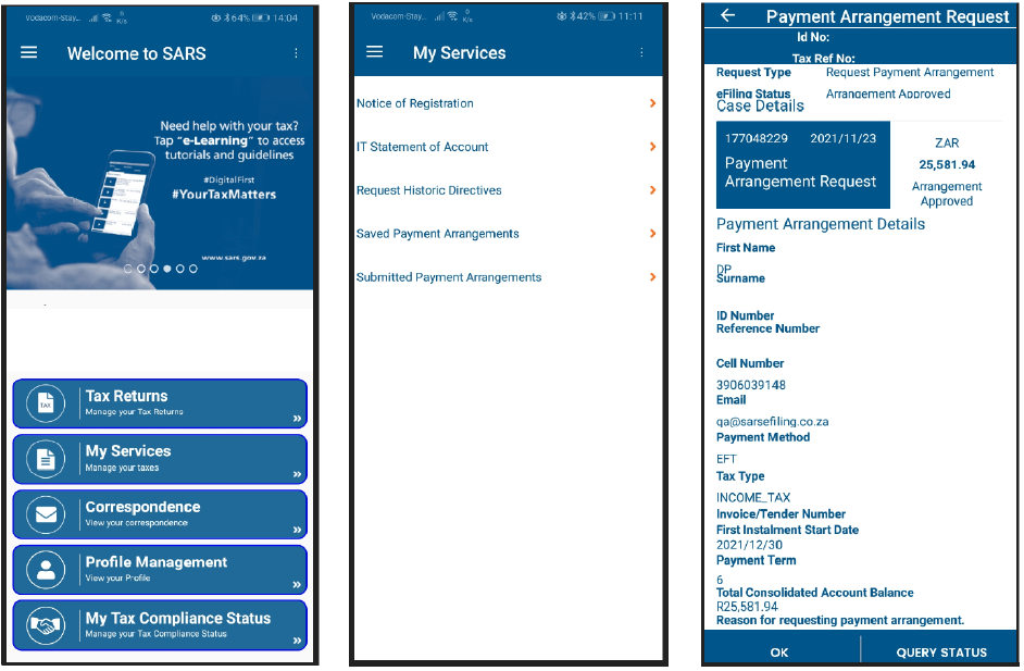 - A new tab labelled “Payment Arrangement” to initiate the payment arrangement request has been added to the following areas on SARS Mobi App, where there is outstanding debt: