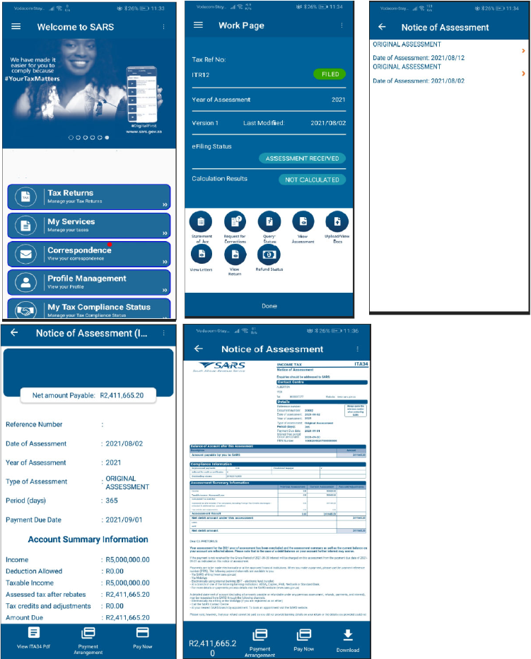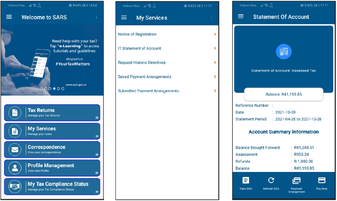 - Log on to the SARS Mobi App and navigate to where there is outstanding debt against an assessed return in order to initiate the payment arrangement request. A payment arrangement request can be initiated from any of the following places where there is outstanding debt and only one tax type request