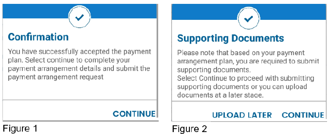 - Tap <Continue> – selecting continue on figure 1, you will be redirected to capture your payment arrangement details. Refer to Capture payment Arrangement Details and by selecting continue on figure 2, you will be redirected to submit supporting documents