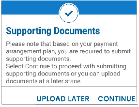 - Upload Later – selecting this tab you will be redirected to the saved payment arrangement screen to upload documents at a later stage.