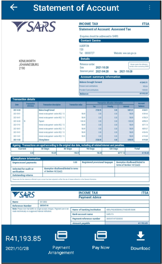 - Once you have successfully logged in to SARS Mobi App, follow the steps below to access your payment arrangement tab from Statement of Account: