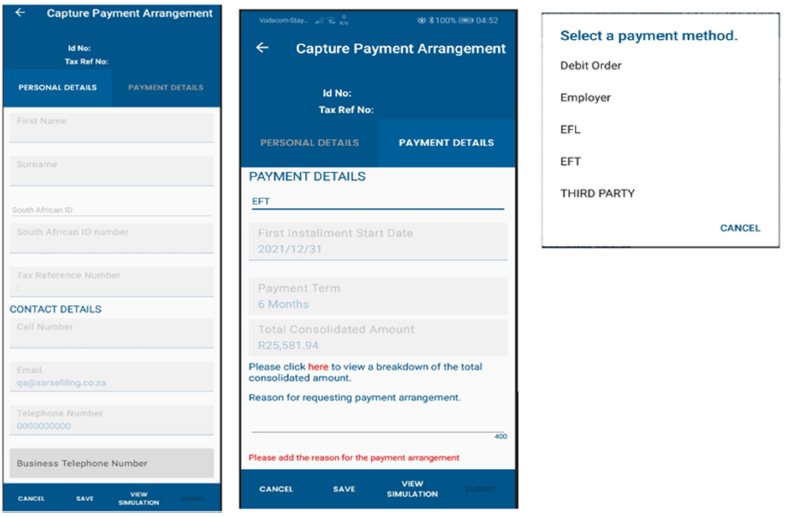 - On the SARS Mobi App, the payment arrangement request functionality will be limited to Personal Income Tax (PIT).