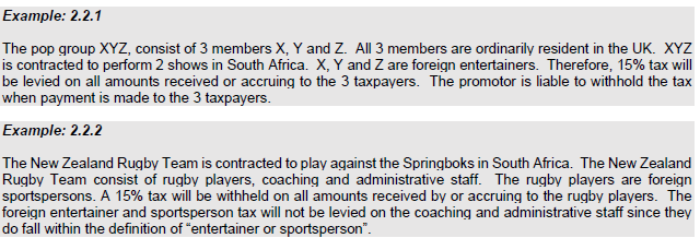 - The activity must be performed in South Africa by an entertainer or sportsperson, either alone or with another person or persons. This includes a non-resident individual who makes use of a company for booking arrangements but performs any of the activities mentionedĀ above.