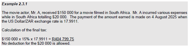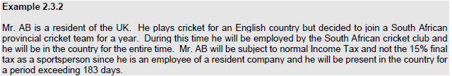 - 15% tax must be levied on all amounts received or accrued to the entertainer or sportsperson (section 47B of the Income Tax Act).