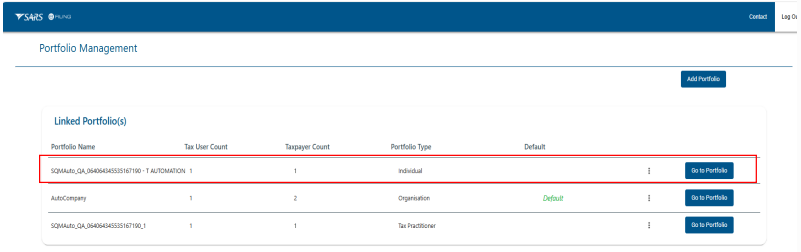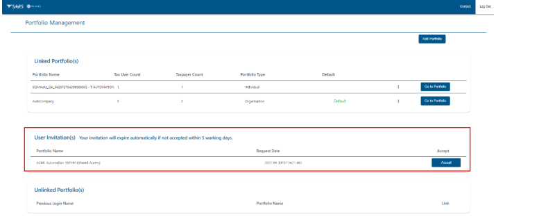 - Displays the Portfolio Management page and the invitee must Accept the invitation within five (5) working days by clicking on the Accept button (to link the portfolio) under User Invitation(s). Failure to do this within the prescribed time period, the invitation will expire automatically.