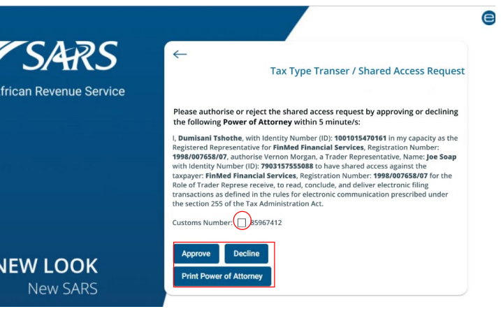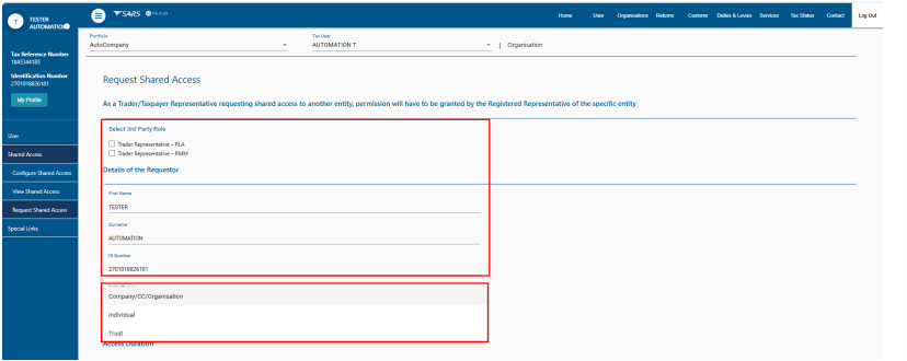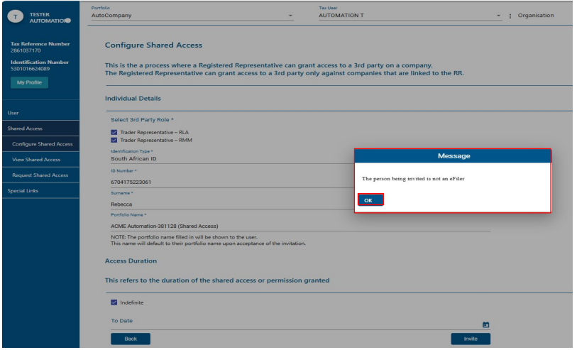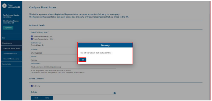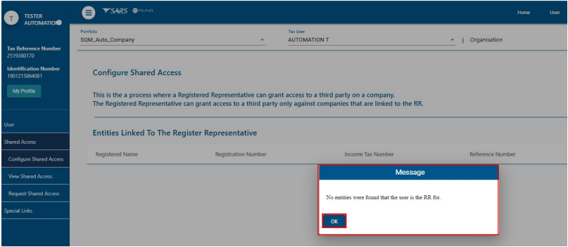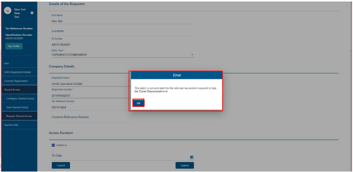 - If the entity’s details captured in paragraph here) above do not match with SARS records the system displays a message requesting the eFiler (trader representative) to review the entity’s registration details and to recreate the request for Shared Access.