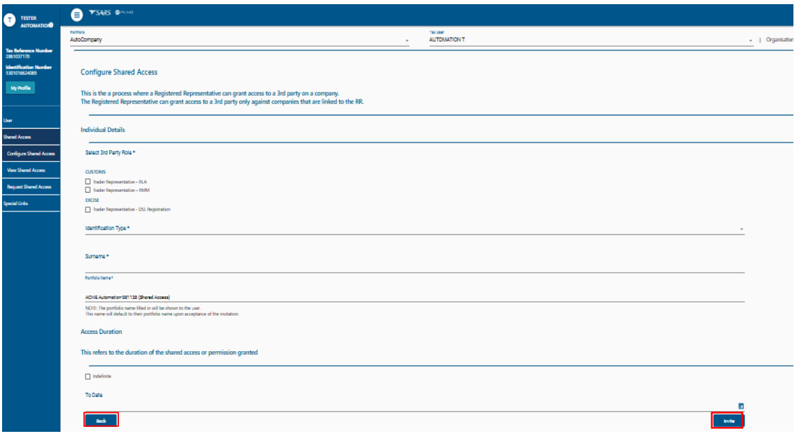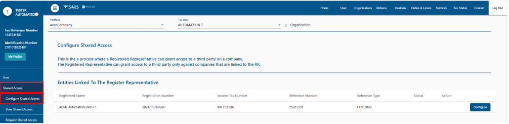 - Displays the shared access details (ready only) and the registered representative of the entity views the shared access details and if: