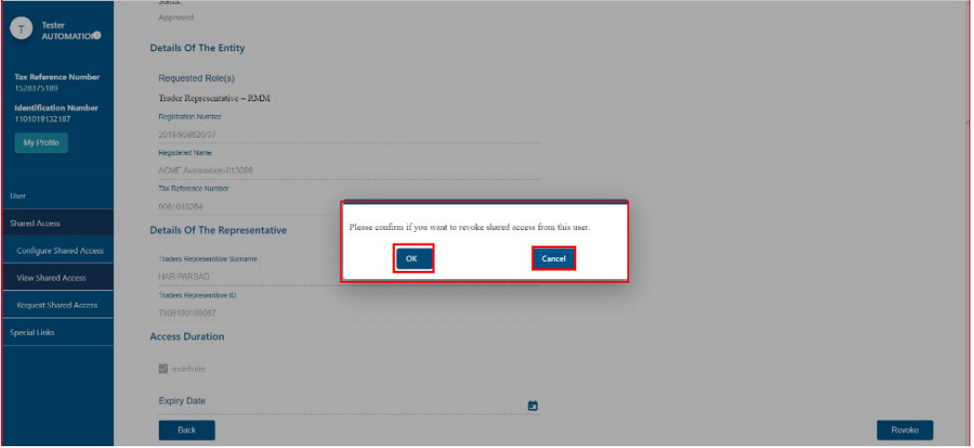 - Â The system displays a message requesting the registered representative of the entity to confirm whether the shared access should be revoked and if the registered representative wishes: