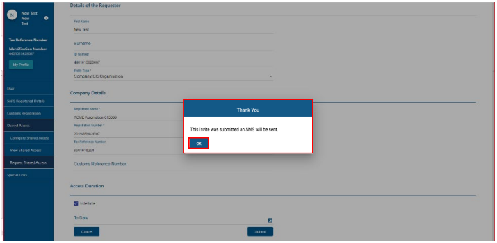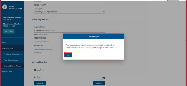 - The system displays a message that the shared access request has been successfully submitted and a notification is sent to the registered representative of the entity for acceptance. The eFiler (trader representative) clicks on the Ok button.