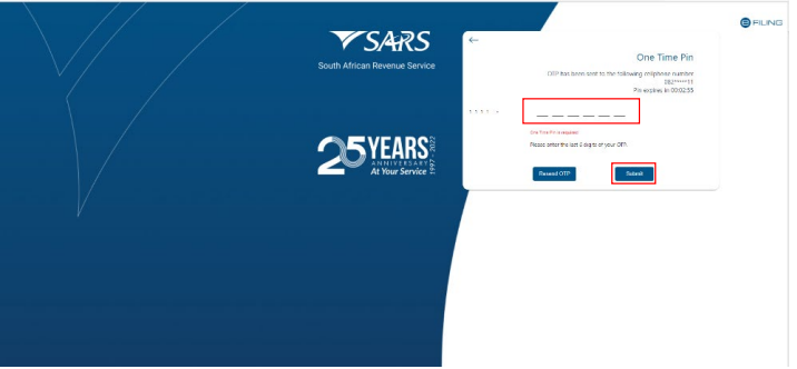 - The registered representative of the entity receives an SMS and / or email notification to go to the SARS website.