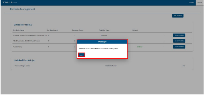 - Displays a message that the invitee has been linked to the eFiler portfolio and the invitee clicks on the Ok button:
