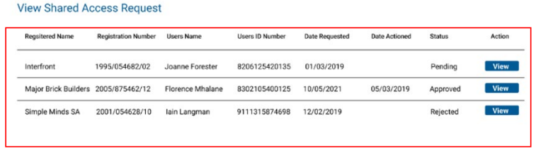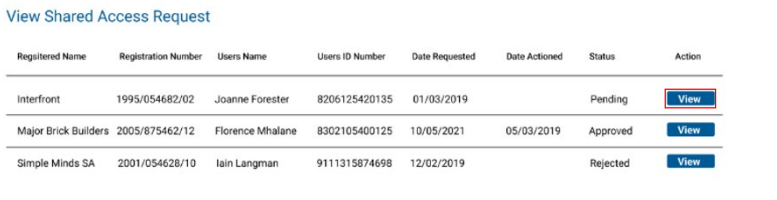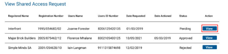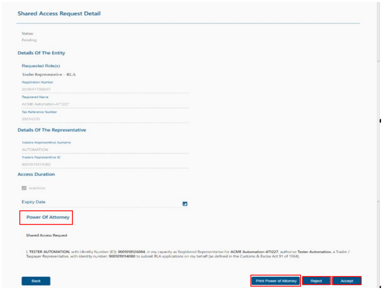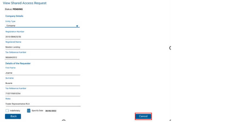 - If a registered representative of the entity does not action the shared access within five (5) working days the system sends a reminder. A total of three (3) reminder notifications will be sent with five (5) working days after each reminder. If the request is not actioned after the last reminder the system automatically cancels the shared access.