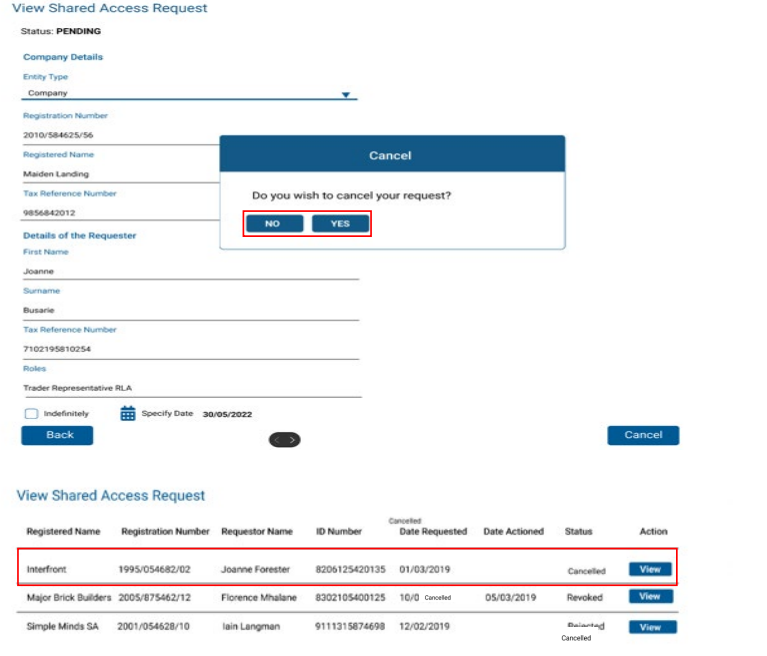 - To continue with the cancellation of the shared access he/she clicks on the Yes button. The system returns to the View Shared Access Request page and updates the shared access request status from pending to cancelled.