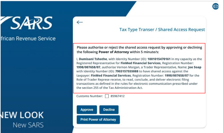 - Clicks on the Decline button. The shared access is cancelled and the eFiler (trader representative) is notified via email or SMS.