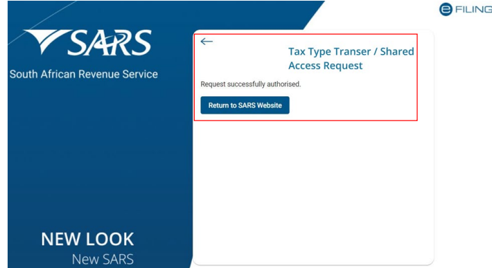 - The registered representative of the entity clicks on the Return to SARS website button.