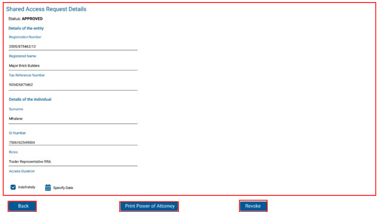 - The registered representative of the entity wishes to continue to revoke the shared access he/she clicks on the Revoke button.