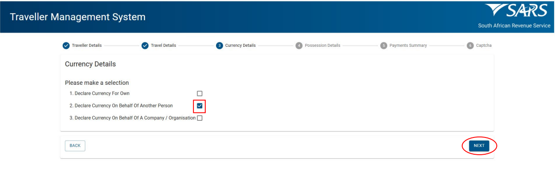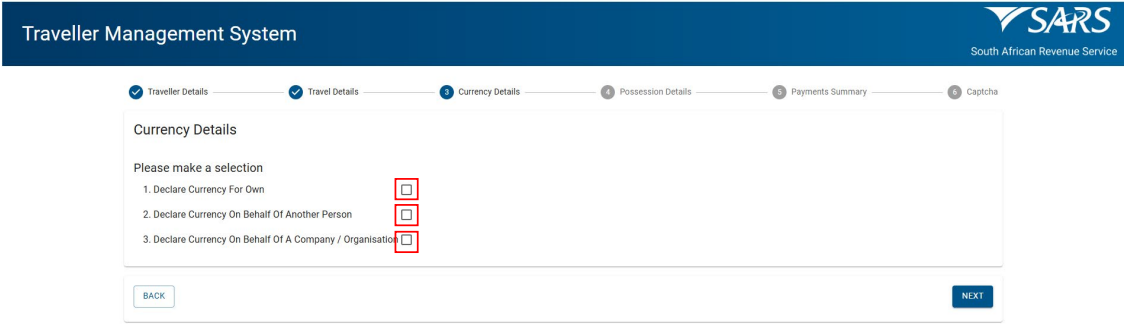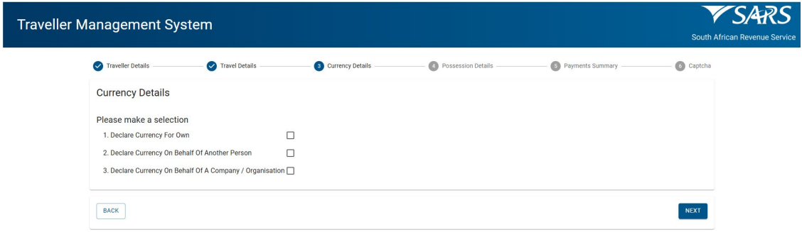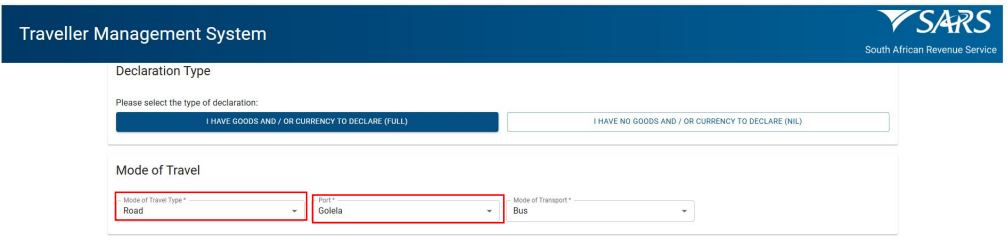 - ‘I have goods and / or currency to declare (Full Declaration)’ – select if carrying goods or currency that must be declared.