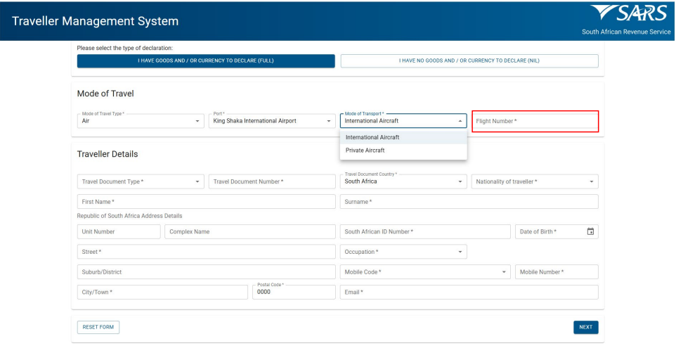 - If “International Aircraft” is selected, enter the “Flight Number”