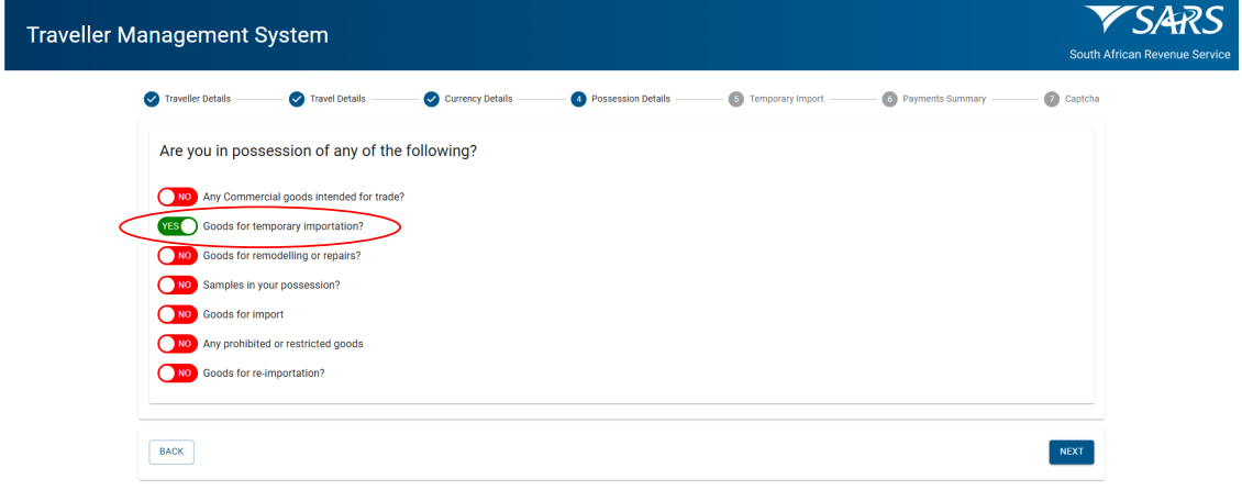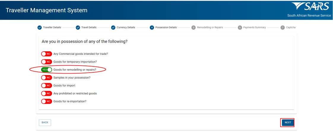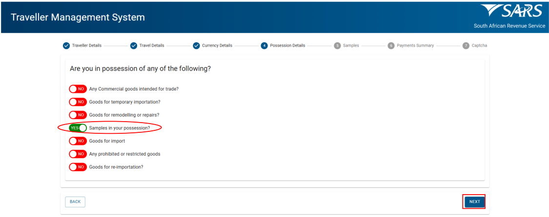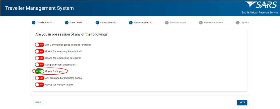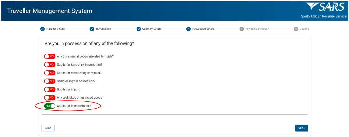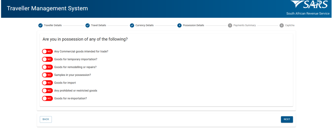 - On the Possession Details screen the traveller must click on the radio button next to each statement to change the selection from no to yes to declare.