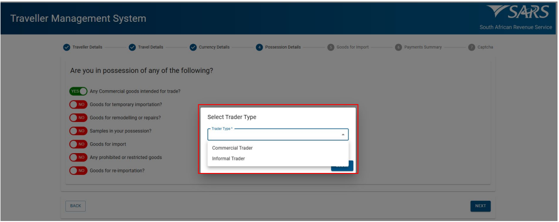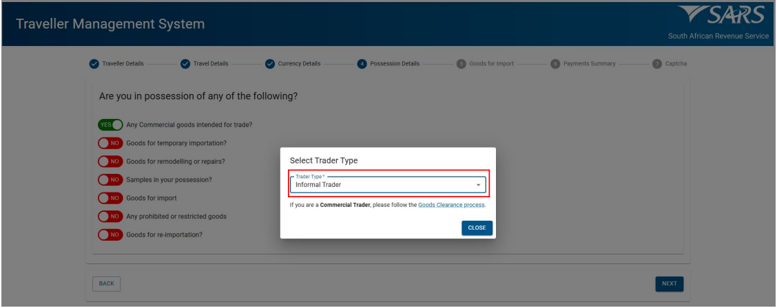 - Select ‘Commercial Trader’ or ‘Informal Trader’ from the drop-down options.