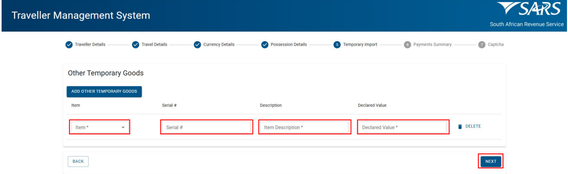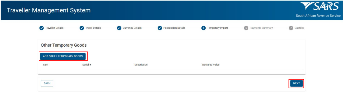- ‘Add Other Temporary Goods’ to capture the goods.