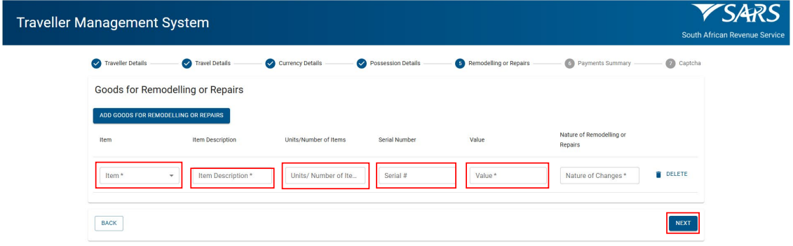 - Clicks ‘Add Goods for Remodelling or Repairs’.