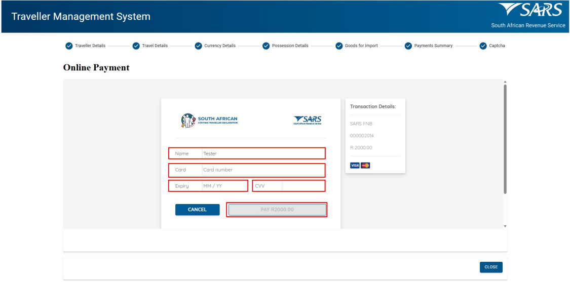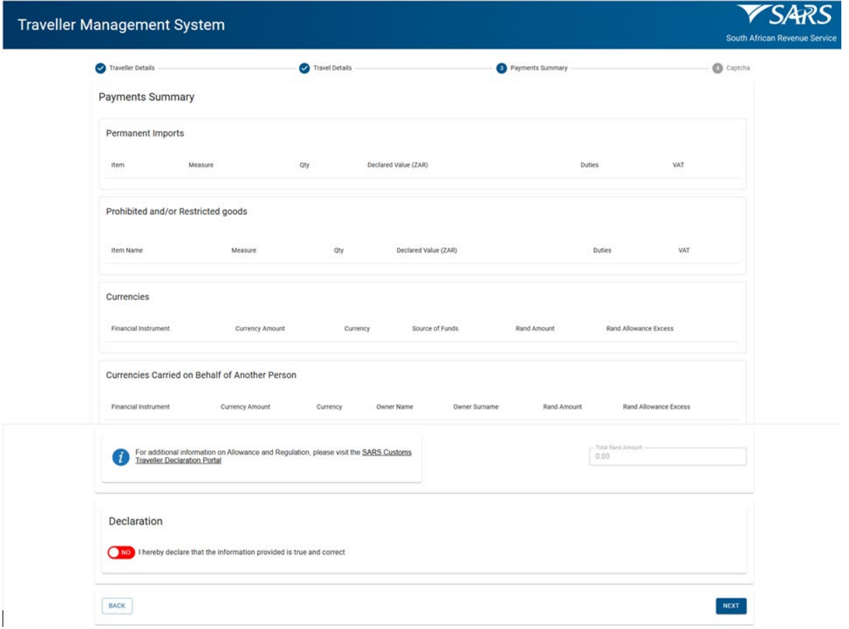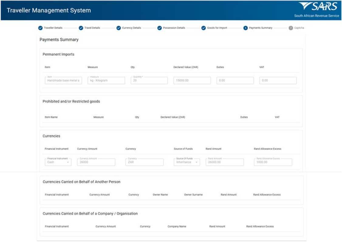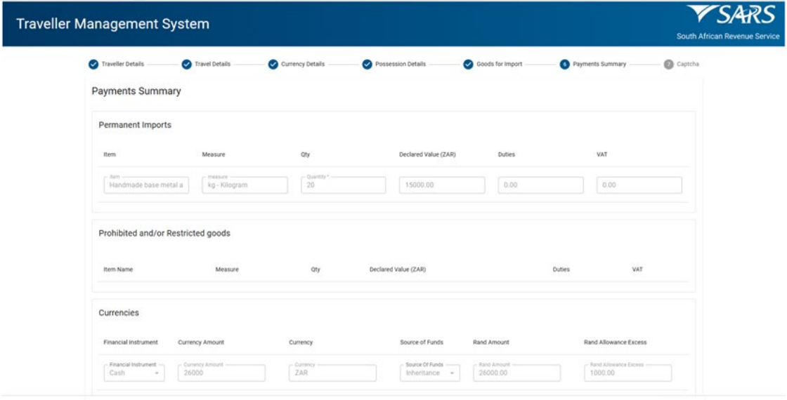 - Payment summary. The amount showing may change after the processing of the traveller’s declaration.