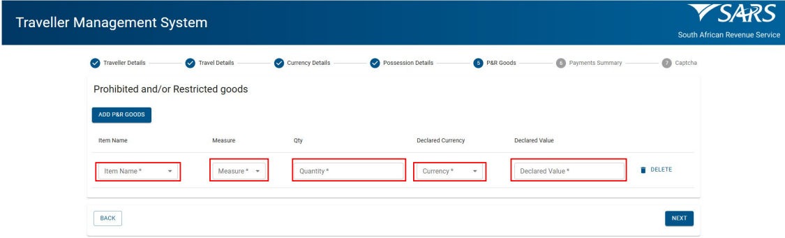 - Prohibited and / or Restricted goods. This section will remain blank if no prohibited / restricted goods are declared.