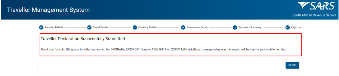 - The SATMS will confirm if the traveller’s declaration has been submitted successfully.