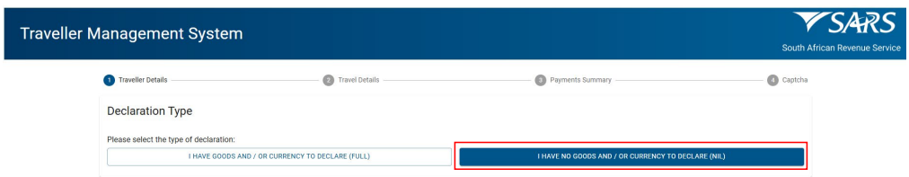- Select ‘I Have No Goods and / or Currency to Declare (Nil)’.