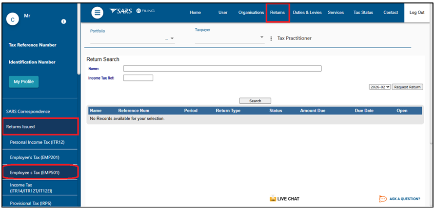 - To check the status of your submission, click on ‘Returns History’ and then select ‘Employees Tax EMP501’.