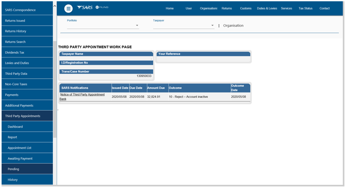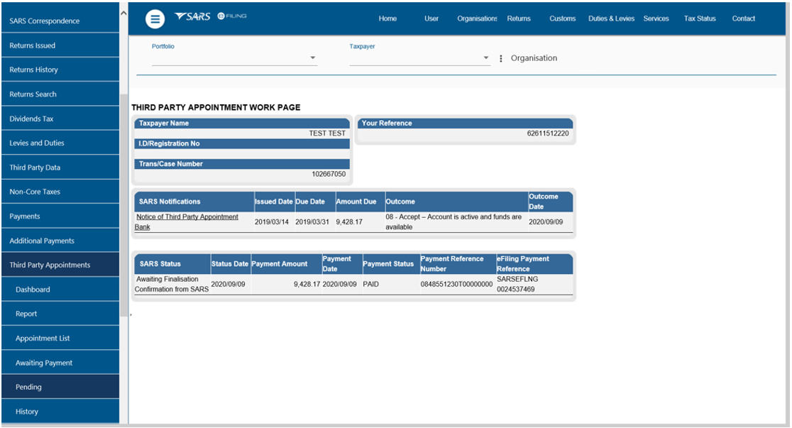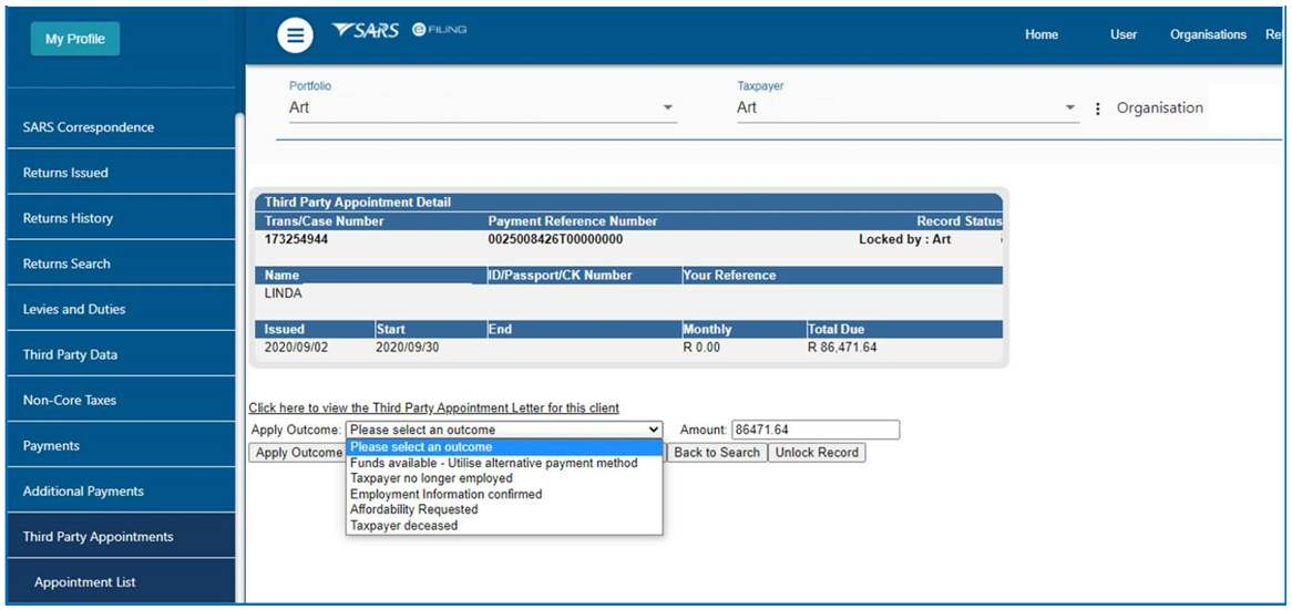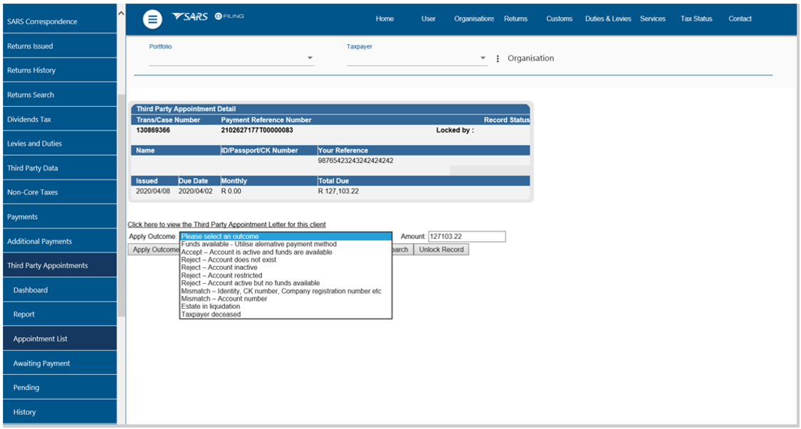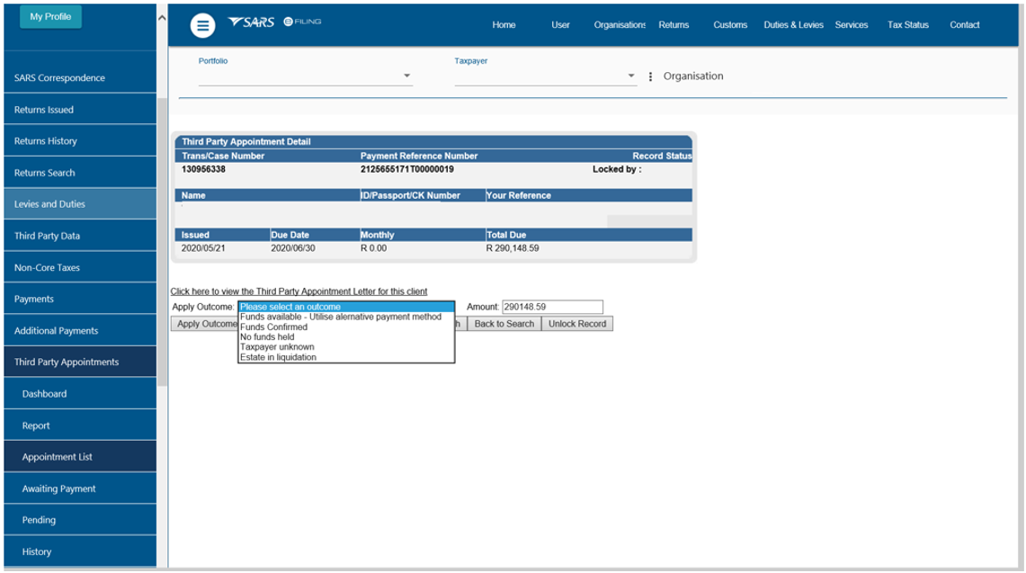- Upon receiving the Notice of Third Party Appointment Letter, the profile will automatically be activated for Third Party Appointment functionality on eFiling and the following options will be available to process TPA letters: When making a payment, all SARS clients must adhere to the payment rules stipulated in this document.