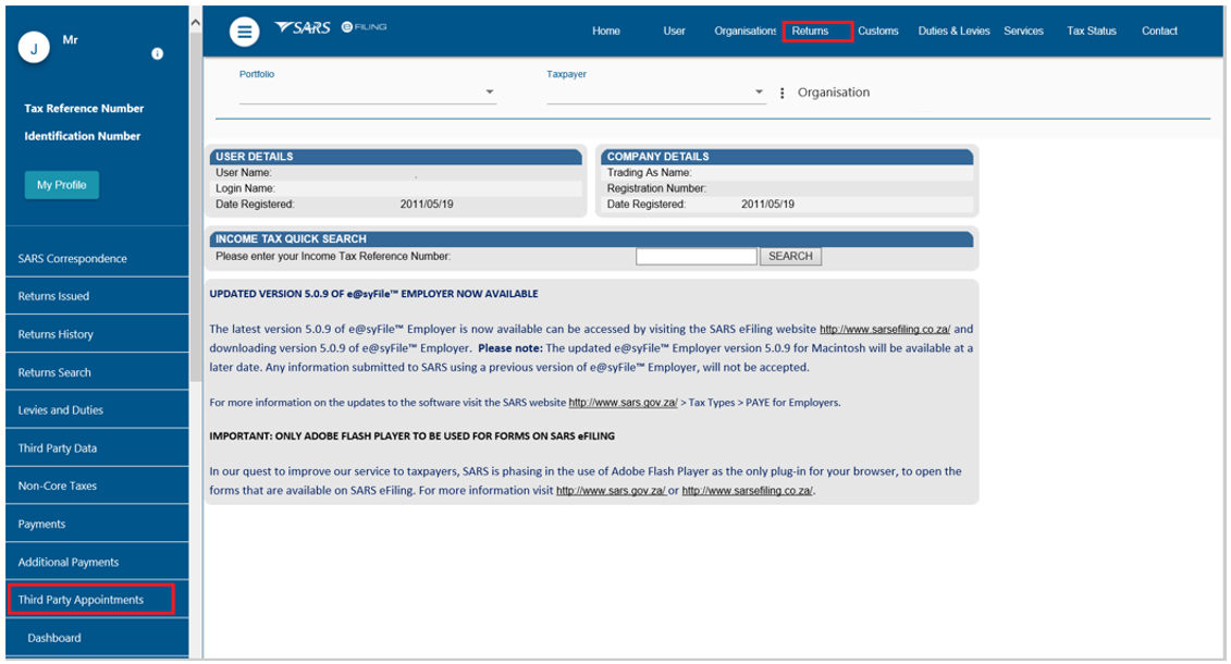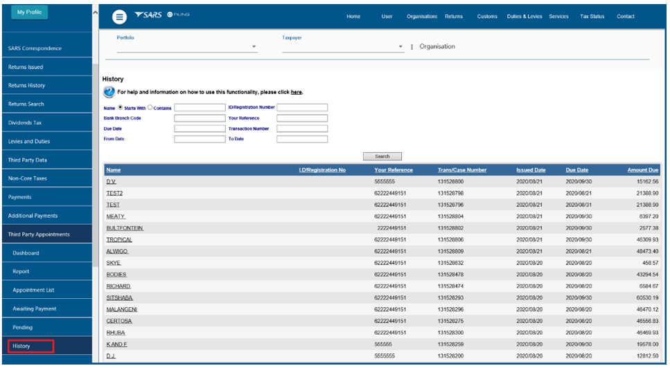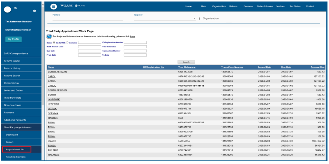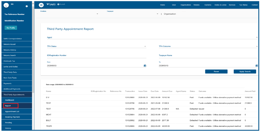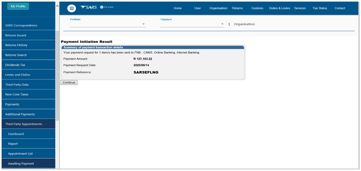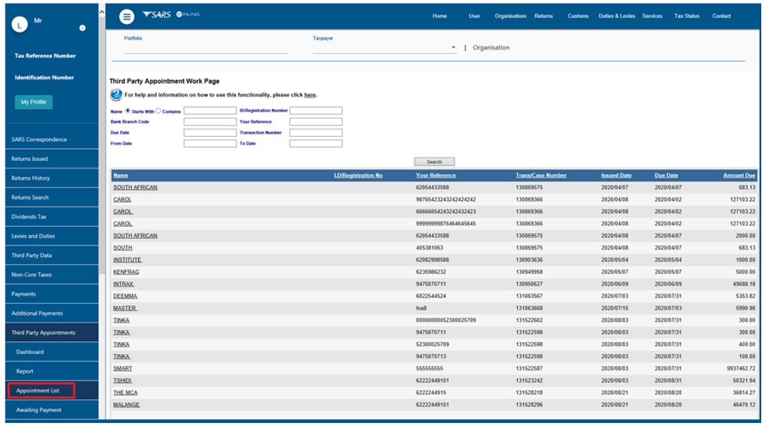 - Upon receiving the Notice of Third Party Appointment Letter, the profile will automatically be activated for Third Party Appointment functionality on eFiling and the following options will be available to process TPA letters: When making a payment, all SARS clients must adhere to the payment rules stipulated in this document.