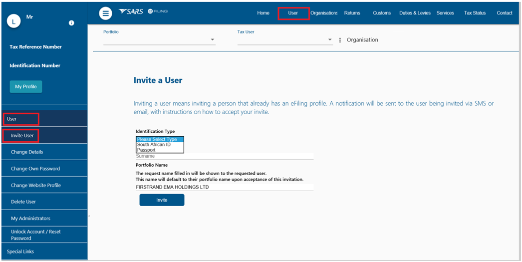 - SMS and email notifications will be sent to the person who has been invited to be a user on an organisation or tax practitioner’s portfolio.
