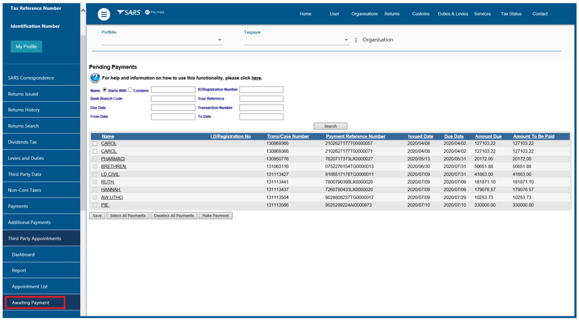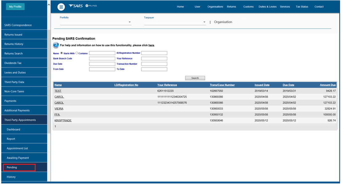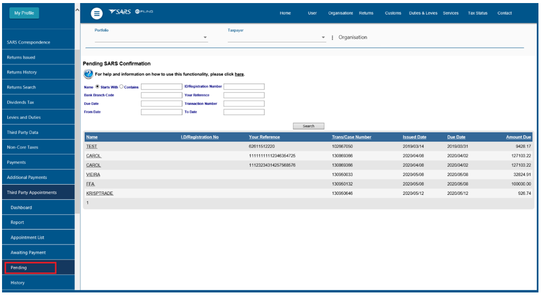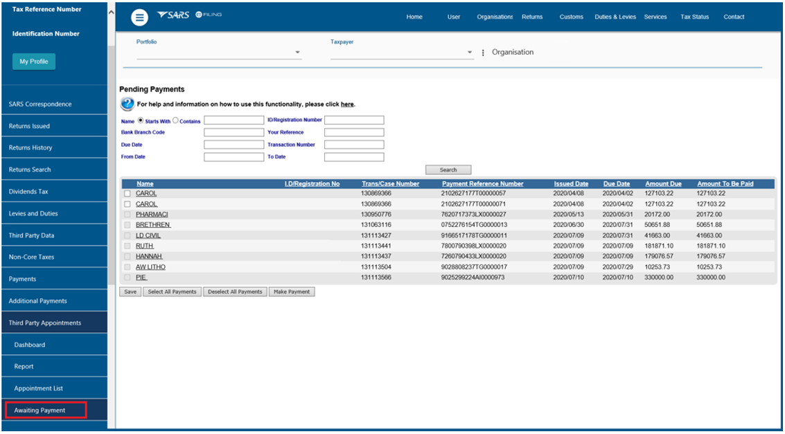 - As soon as payment is made, the status will be updated to ‘Awaiting Finalisation Confirmation from SARS’ and the record must move into the ‘Pending’ grid.