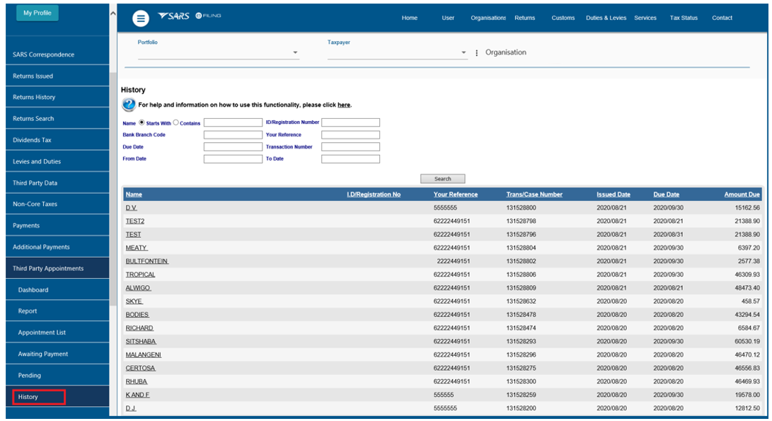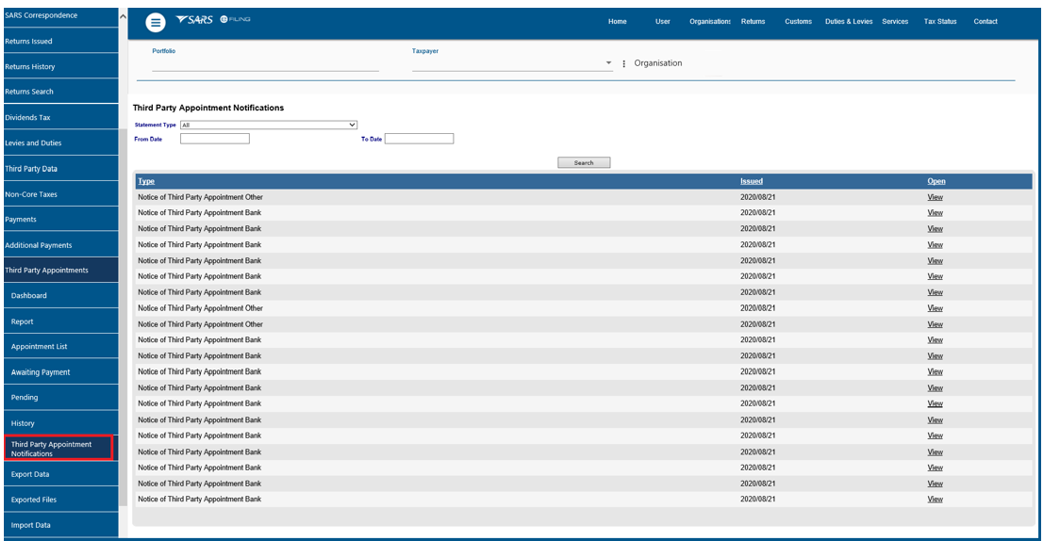 - Access the letter by clicking on the “Third Party Appointment Notifications” side menu under the Third Party Appointment functionality or access it under SARS correspondence under search letters functionality. Refer to Appendix 1