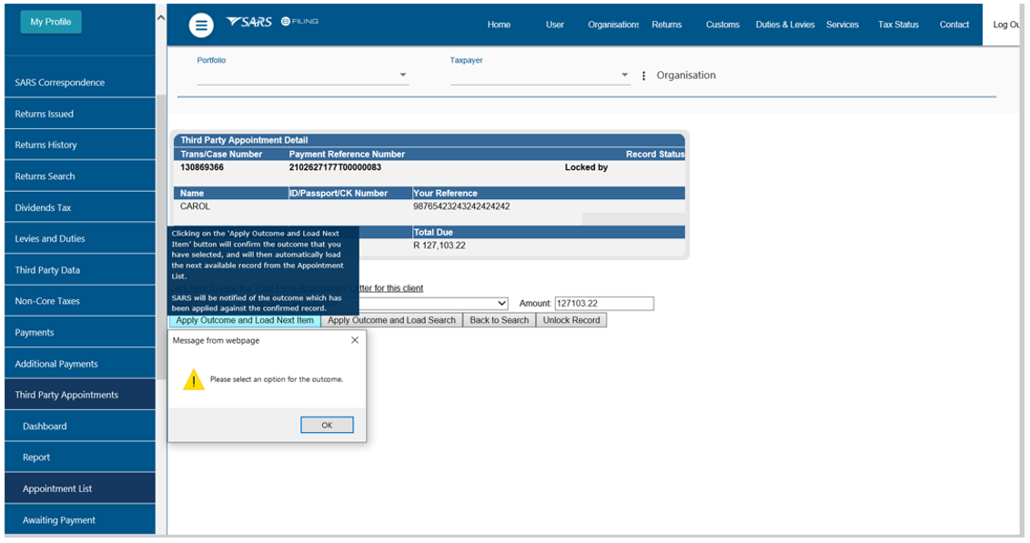 - No changes will be permitted to work items for which a cancellation outcome has been committed. If a Third Party Appointment work item has been incorrectly cancelled, please contact the SARS.