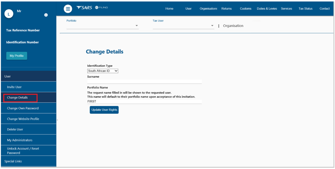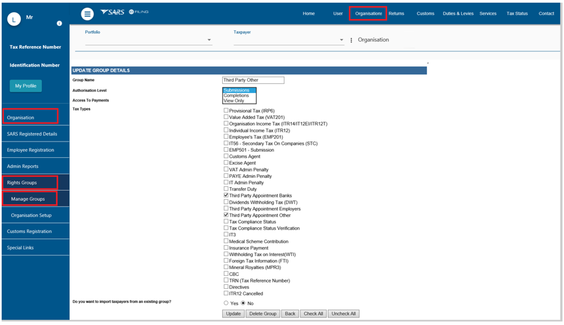 - In order to activate the tax type functions and services on eFiling (e.g. Third Party Appointments) you must ensure that the correct rights and authorisation levels have been allocated to users.