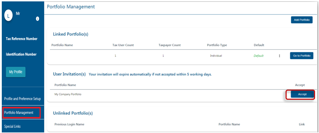 - Select <My Profile> and <Portfolio Management> from the menu on the left